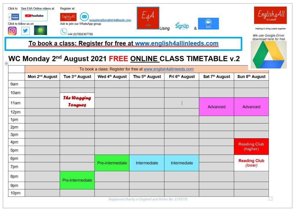 Online classes are continuing through August with a reduced timetable. See below for details. Registration is required at www.english4allinleeds.com